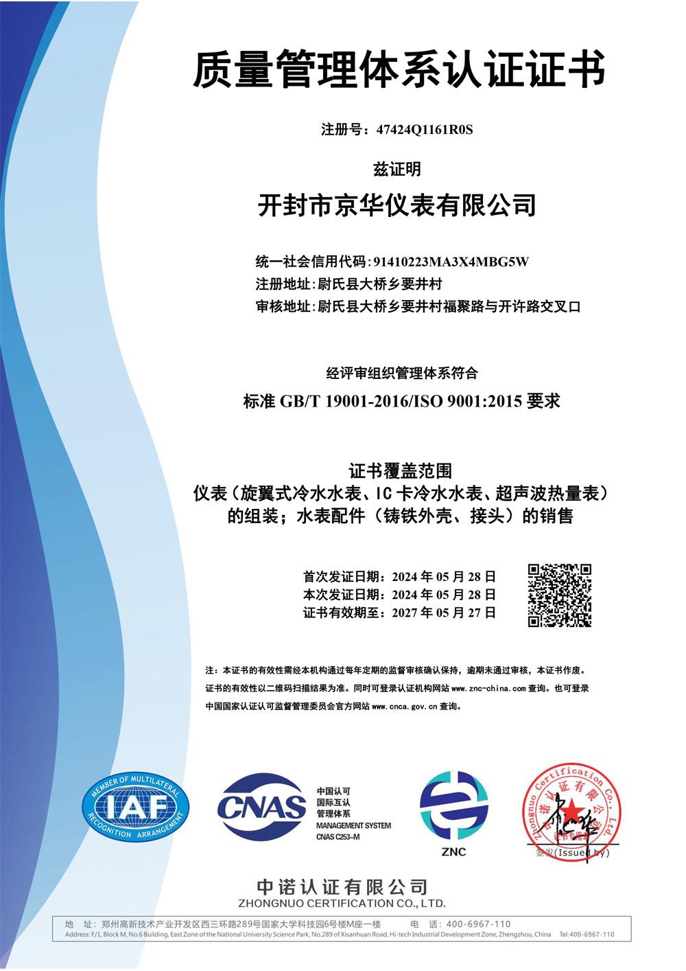 質量管理體系認證證書